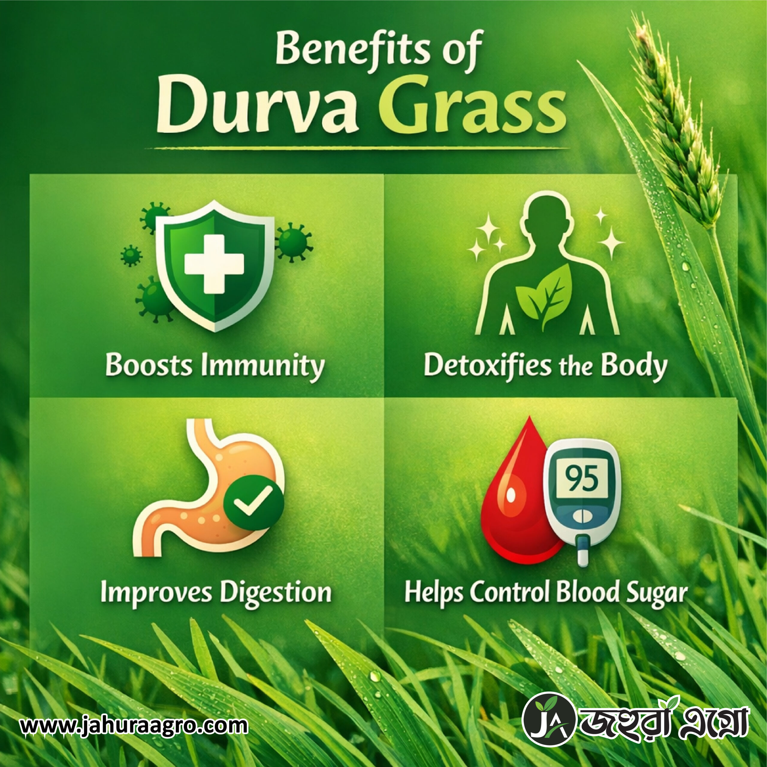 দুর্বাঘাস শুধু ঘাস নয়—এটি একটি শক্তিশালী, বৈজ্ঞানিকভাবে প্রমাণিত ভেষজ উৎস। রক্তে শর্করা নিয়ন্ত্রণ, লিভার সুরক্ষা, কিডনি পরিষ্কার, ক্ষত নিরাময়, অ্যান্টিঅক্সিডেন্ট—সব মিলিয়ে এটি অসাধারণ।